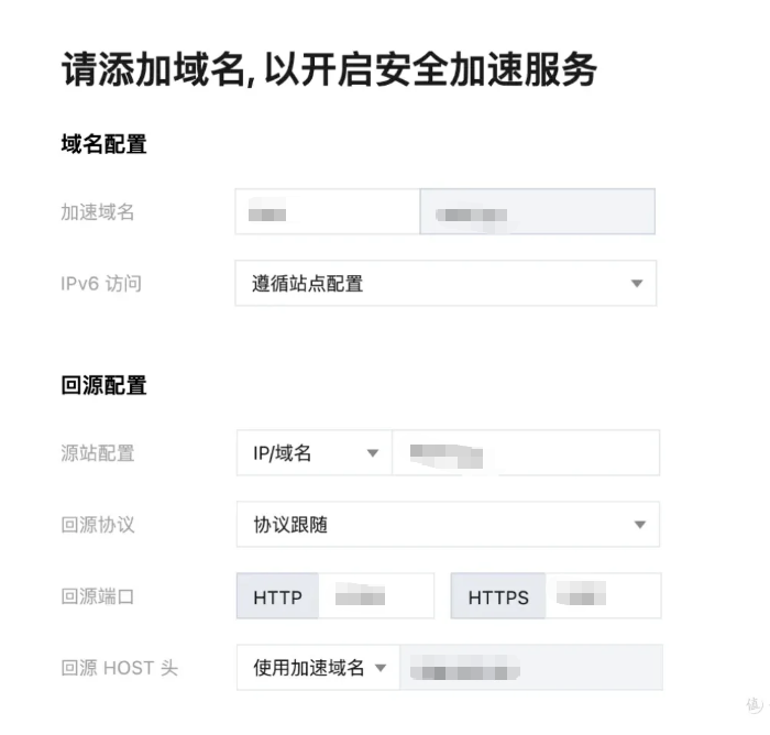如果你已经ddns用域名加端口搞定访问了,那么添加好根域名以后,就可以去添加域名了,加速域名就是你根域名下面的域名,回源的源站就是你ddns时候的域名,端口也填对应的就行,协议的话你原来访问是啥协议你就写啥协议