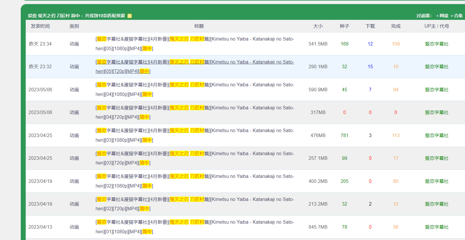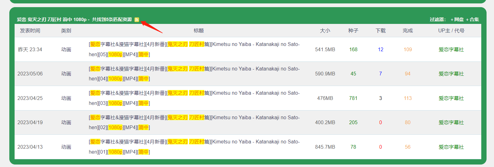 之后在这里点击这个类似wifi的标志,我就获得了它的rss订阅源,https://comicat.org/rss-%E7%88%B1%E6%81%8B+%E9%AC%BC%E7%81%AD%E4%B9%8B%E5%88%83+%E5%88%80%E5%8C%A0%E6%9D%91+%E7%AE%80%E4%B8%AD+1080p.xml