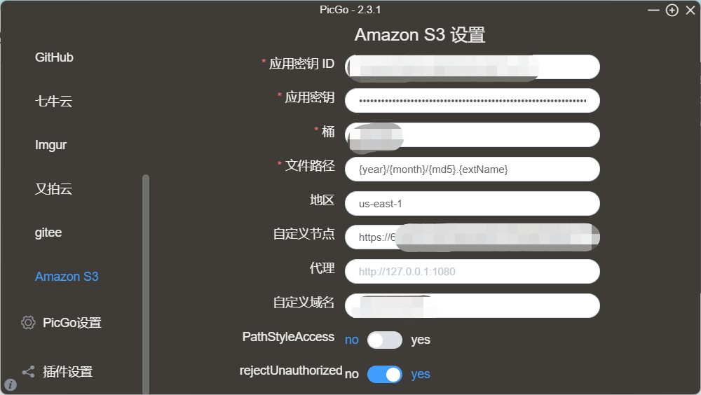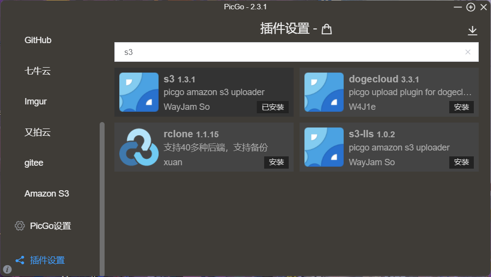 这里我选择安装picgo实现图片上传,picgo的安装我就不讲了,这里我们直接讲插件,首先去插件那里安装s3插件,然后填入上面记住的那些东西就行了,总之就是一步到位