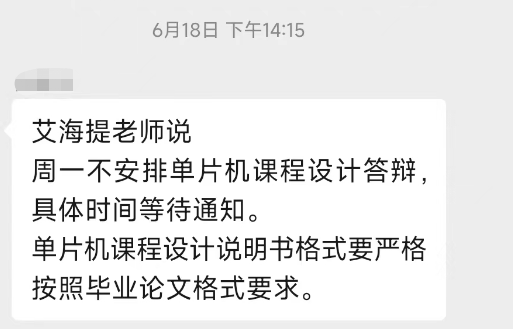 有一说一,单片机的课程设计才算离谱,原本大家都以为是这周一,也就是19号才答辩,所以我们都提前买了20号的票回家,但是离谱的是18号下午的事情