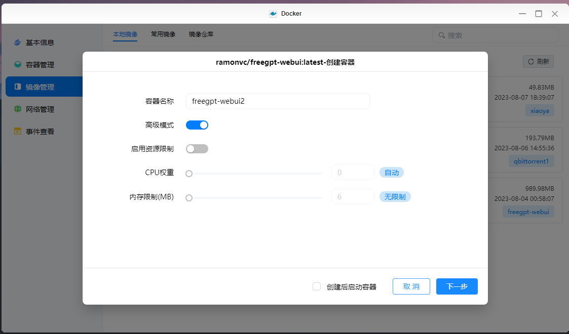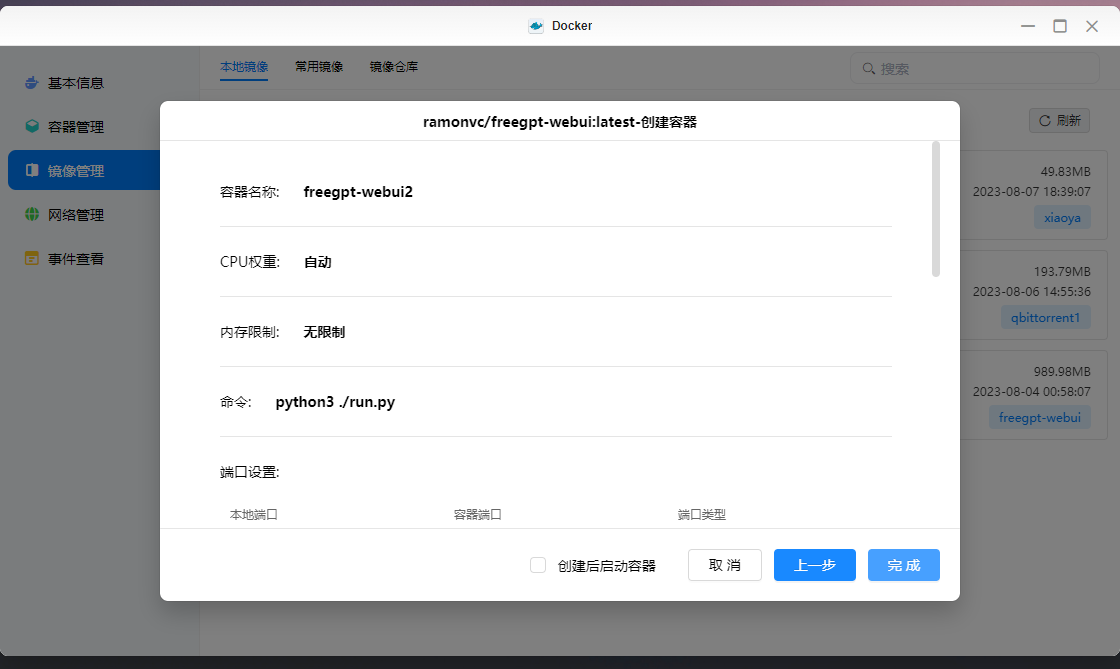 等待下载完成后,容器名字可以自定义,在配置里基础信息自己可以随意填,重启策略什么的按自己需求来