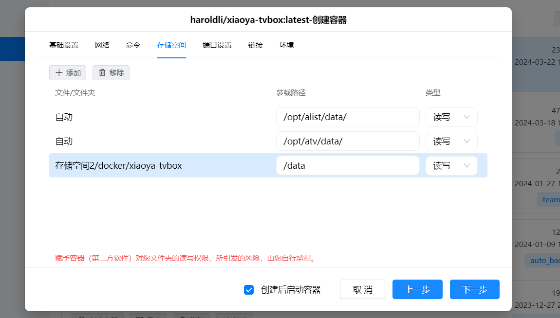之后就是制作容器,储存空间这里前两个我们选择读写,自动就可以了,第三行这里我们需要自己创建文件夹,装载路径/data,类型读写