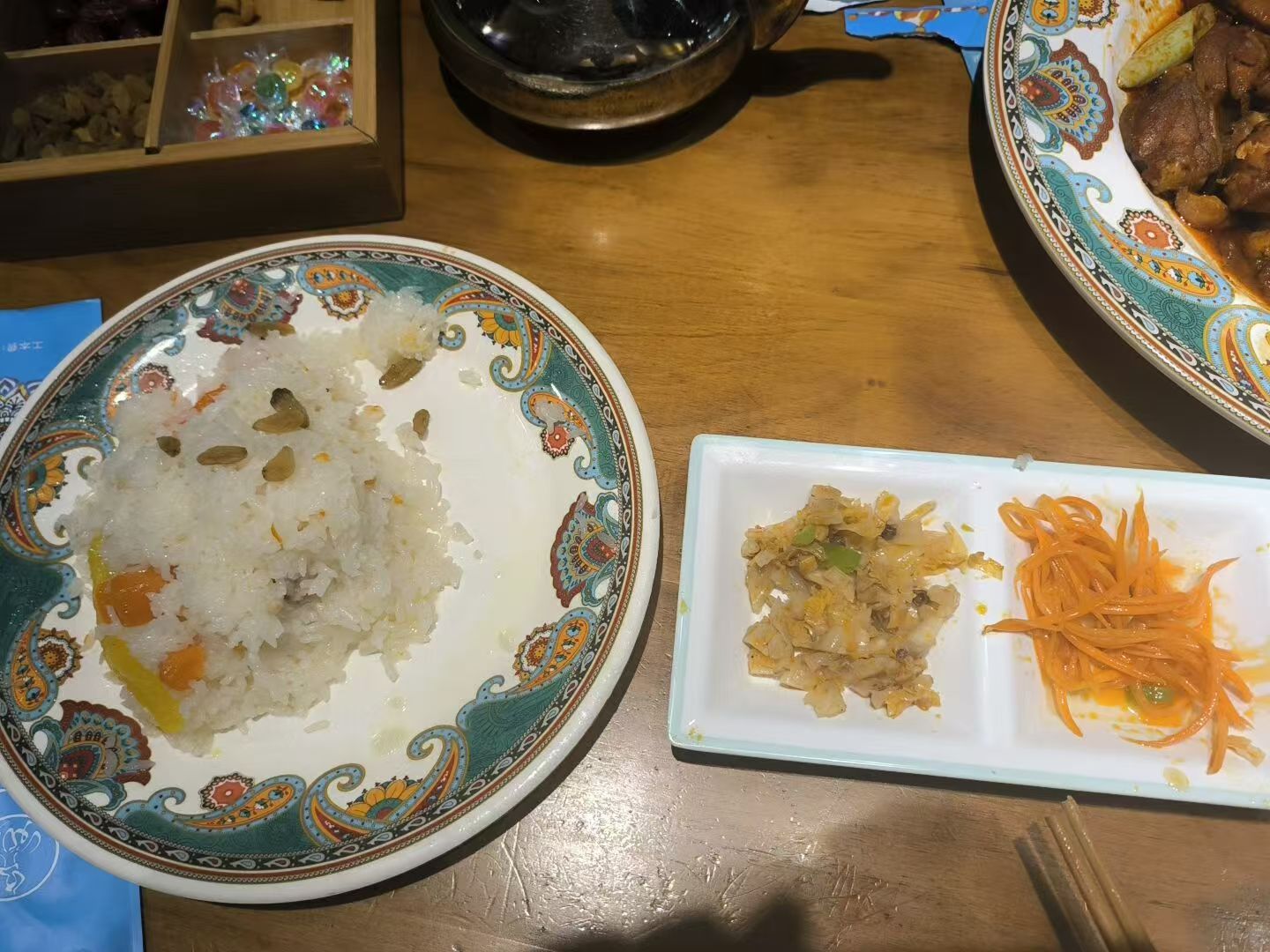 于是我跟首席还有另一个人,三个人一起出发去吃个午饭,我们点的新疆菜,味道还不赖,可惜我吃不进去