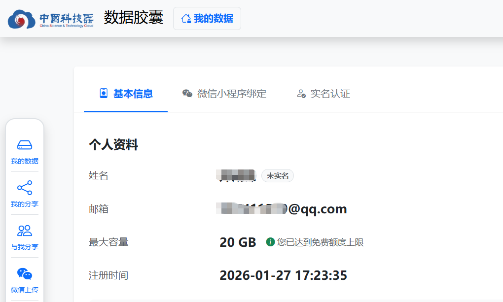 中科院数据胶囊官网:https://data.cstcloud.cn/,如果直接莽,但是不实名你就只有1GB的存储